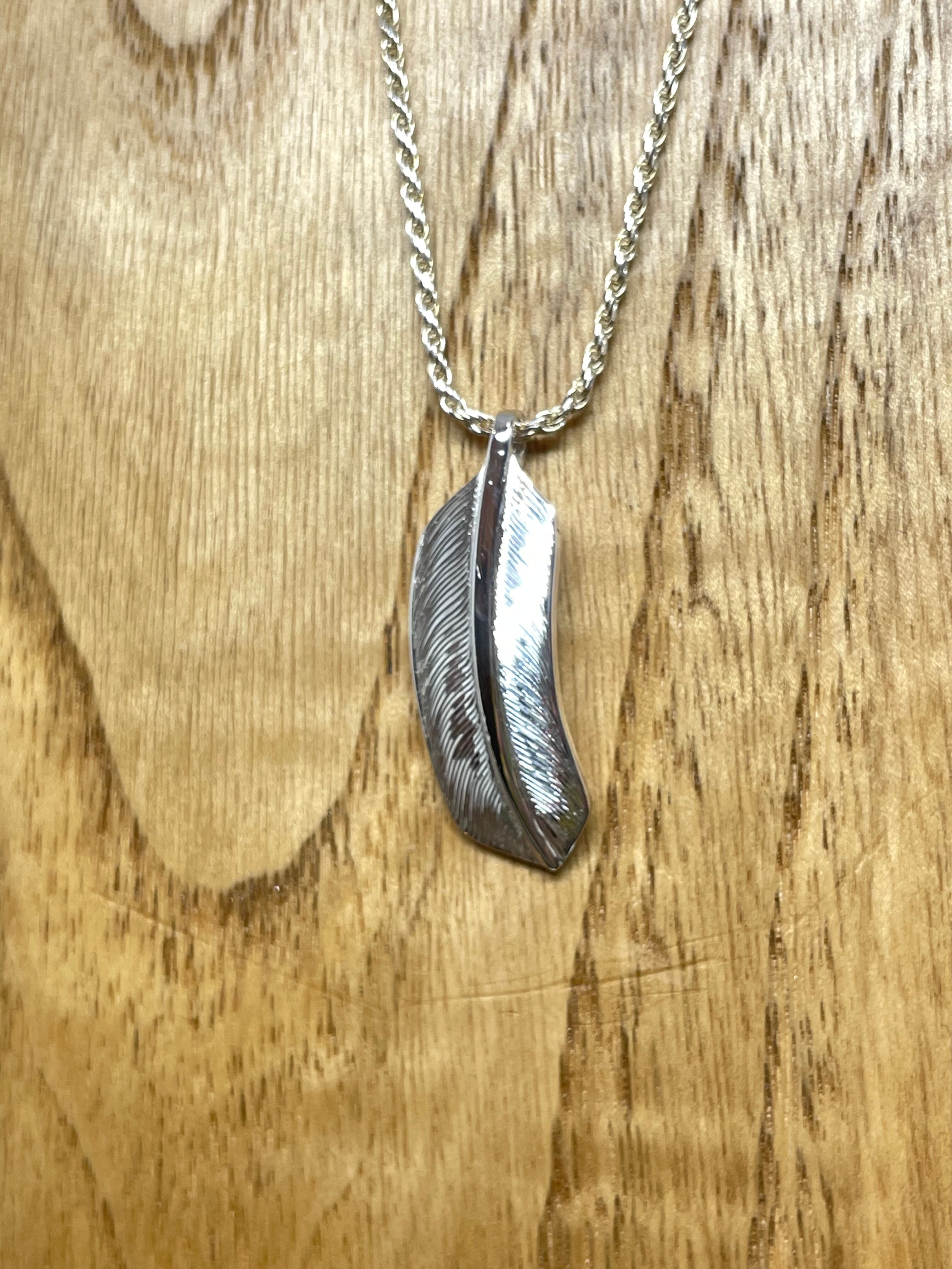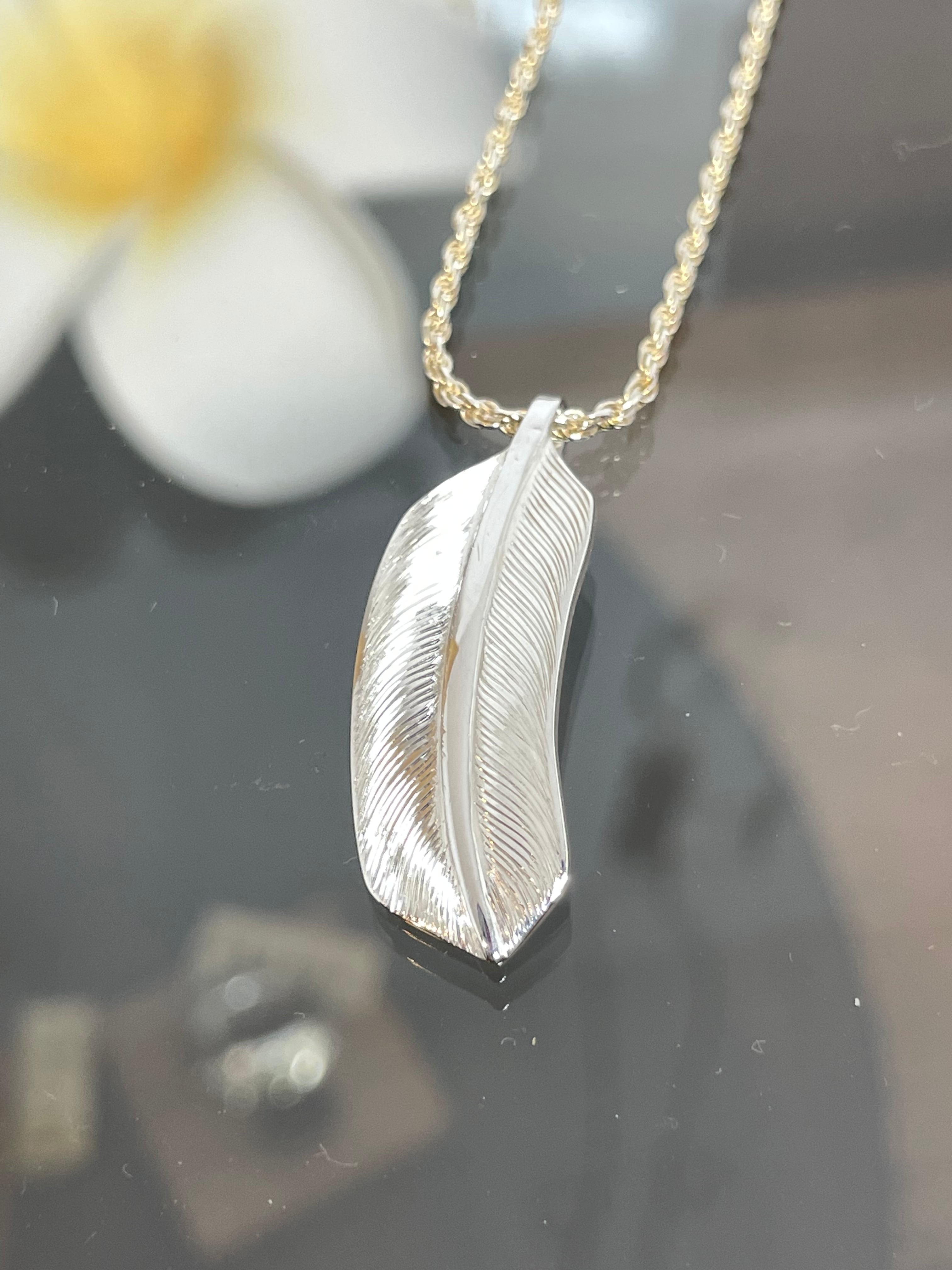 このフェザーネックレスは職人の手仕事によって生み出されました。銀の板を丁寧に切り出し、しなやかなカーブを持たせることで、見事なフェザーモチーフが完成しました。一つ一つが手作りであるため、世界にひとつだけの特別な存在となります。